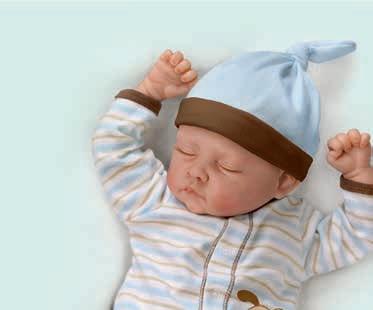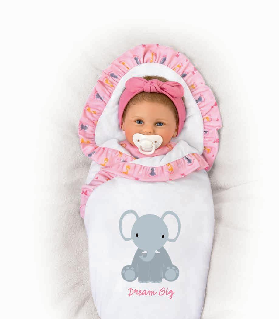 Handcrafted of soft RealTouch® vinyl skin, with hand-applied hair and handpainted fingernails and toenails. Her newborn features are so realistic. Her body is loosely jointed, too, so she feels just like a real newborn infant in your arms, lay your hand on ‘Ashley’ and feel her ‘breathe’.