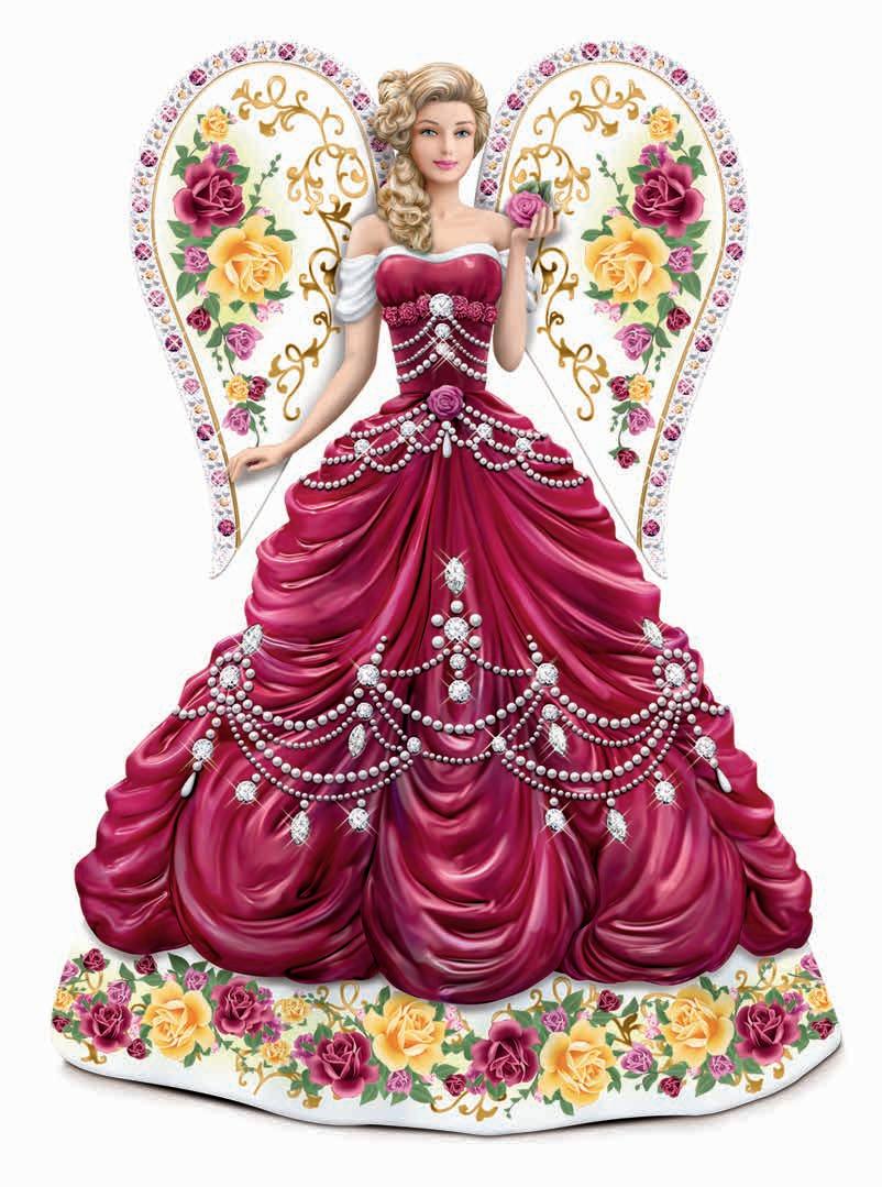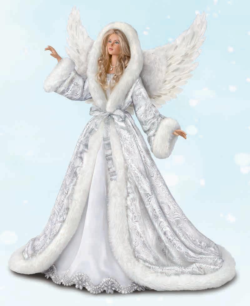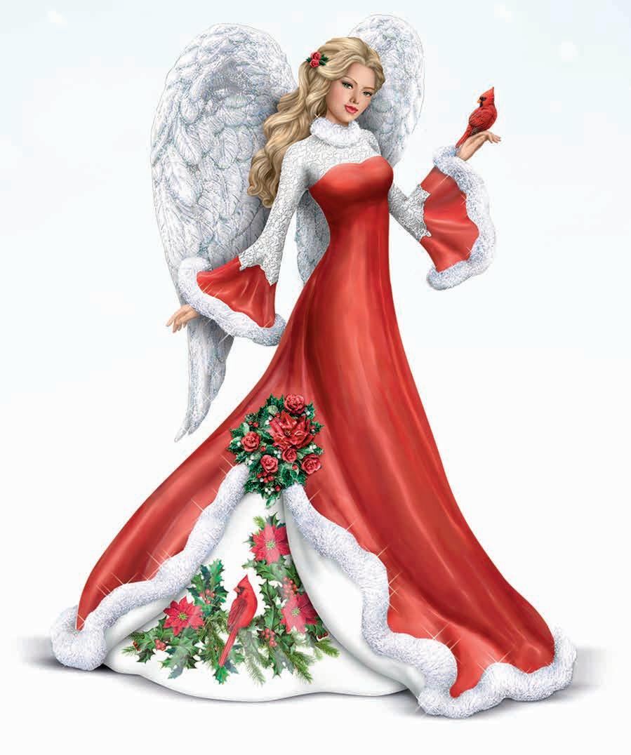 This handpainted angel figurine is handcrafted in artist’s resin and cloaked in pearlescent, metallic and glossy hues. Her majestic wings shimmer with iridescent glitter and her gown features fur-look trim and hand-etched, bas-relief lacy patterns on the bodice and down the sleeves. Tender artistry of a cardinal is hand-applied to her underskirt and another fully sculpted cardinal friend perches on the angel’s outstretched hand.
