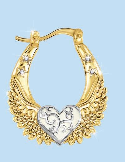 Handcrafted and handpainted, with golden flowing locks and a pearlescent gown, this angelic symbol of devotion and love clasps a golden winged heart. This figurine showcases heavenly white wings edged with golden feathers and golden roses in her hair.