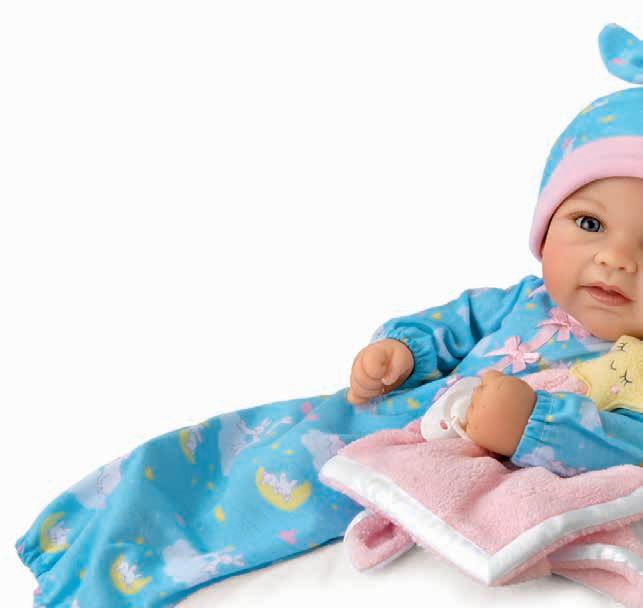 Handcrafted So Truly Real® baby doll, with soft RealTouch® vinyl skin and handpainted to achieve the warm blush of new life. She comes snuggled in a soft pink fleece baby bunting with white bow to keep her comfy and warm. She arrives dressed in a pink one-piece outfit with moon and cloud appliqué on the front and hat, accented with colourful stars. Item No. 03-02858-001