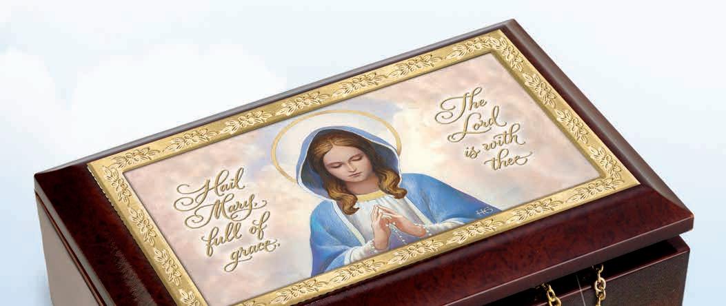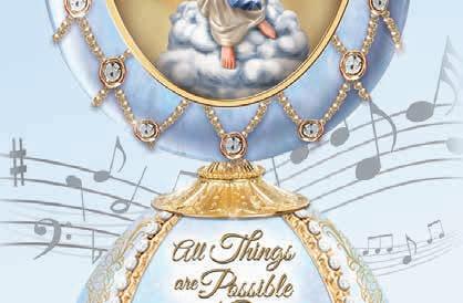 Hand-cast of artist’s resin and handpainted, the sculptural Jesus is portrayed with a gentle expression and open arms. Enhancing His radiance, a light built inside shines upon the figurine. The base is graced with words from scripture, ‘All Things Are Possible with God’, and golden filigree. A piano melody of, ‘Amazing Grace’ plays.
