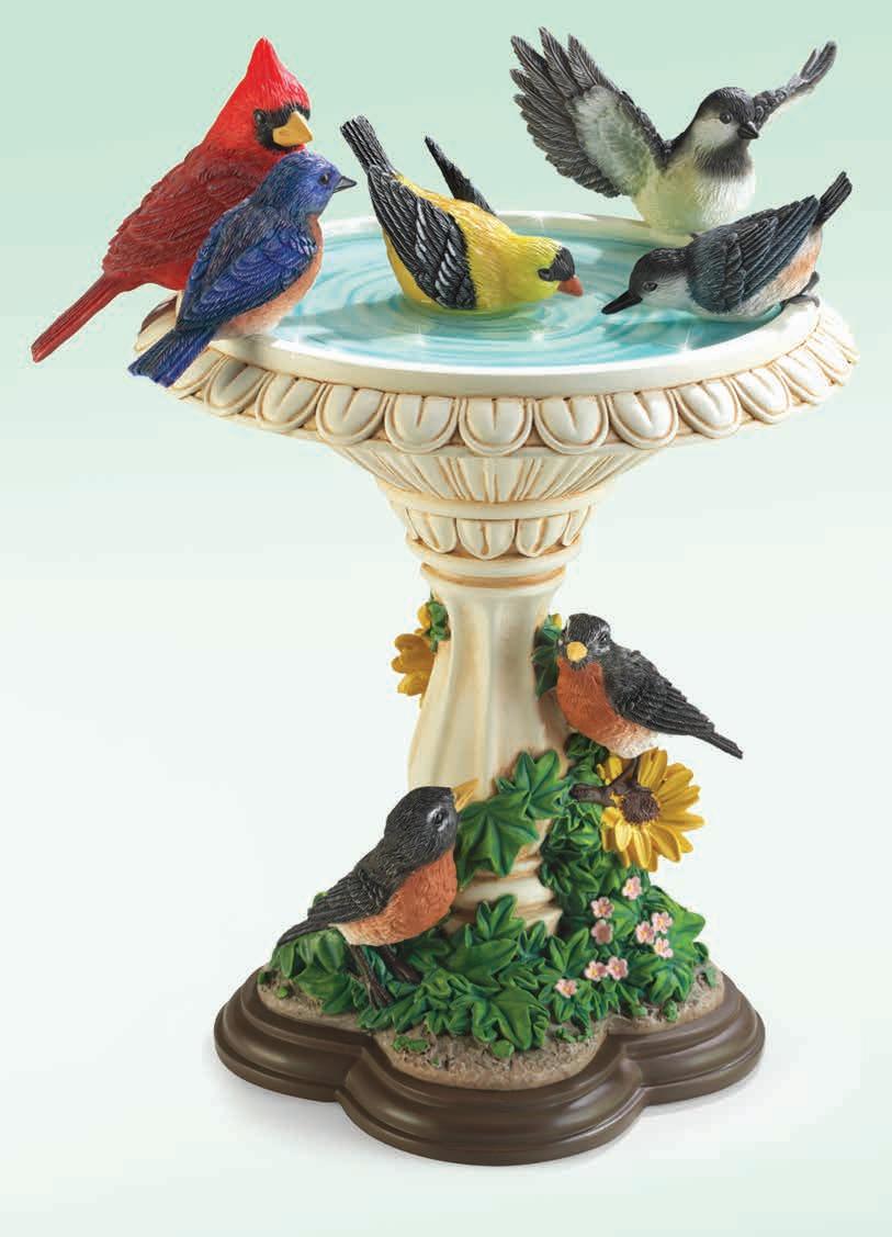 Handcrafted of artist’s resin and handpainted to capture every detail, including an array of lifelike sculptural songbirds perched upon a ‘ribbon’ wrapped wreath. An array of classic holiday accents, including sculpted holly leaves, bright red berries, pinecones and three illuminated lanterns, are placed along the shimmering, ‘snow’-tipped wreath. At the flip of a switch, 13 built-in LED lights turn your wreath into an illuminated masterpiece.