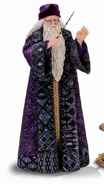 Handcrafted in artist’s resin, this official figure is designed for true-tolife actor resemblance, featuring high-quality mohair hair, and poseable arms. His brocade robe, complete with cuffs and collar, can be removed to reveal satin pants and matching tunic accented by gold ribbon trim. A velour-accented hat rests atop his head, and sculpted resin glasses adorn his face, both removable. FAWKES™ the phoenix stands upon his perch, and DUMBLEDORE’S™ wand awaits its master’s command.