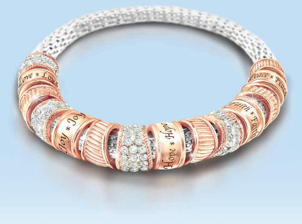 This unique stretch bracelet is handcrafted with five genuine turquoise beads and six solid copper beads plated in 18-carat rose gold. Each copper bead features an engraved word of inspiration – ‘Joy’, ‘Belief ’, ‘Love’, ‘Hope’, ‘Peace’ and ‘Beauty’.