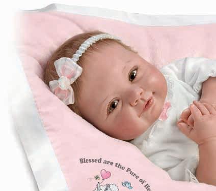 Handcrafted with soft RealTouch® vinyl skin and weighted, she feels incredibly lifelike in your arms. You’ll love how her handpainted features and hand-rooted hair radiate with the innocence of her pure heart. Arrives wearing a pristine white outfit adorned with delicate ruffles of lace and tiny pink bows sparkling with iridescent sequins on the front and back. Comes with her very own baby blanket.