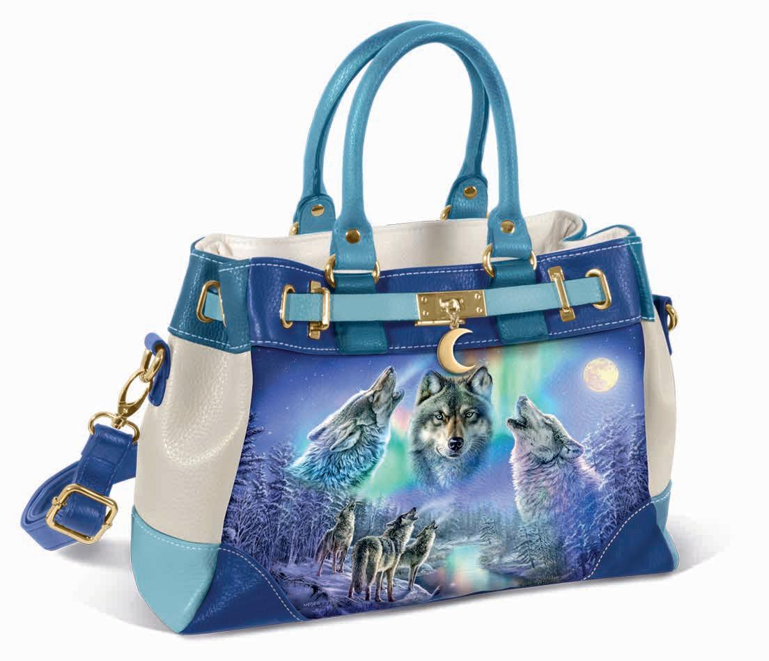 Handcrafted from pebbled faux leather in colour-block combinations reminiscent of a wintery aurora borealis. James Meger wolf art adorns the front, whilst blue double faux leather handles and an adjustable, removable cross-body strap, a zipped main compartment, an interior zipped pocket and two slip pockets. A golden crescent moon charm suspends from a co-ordinating style belted accent.