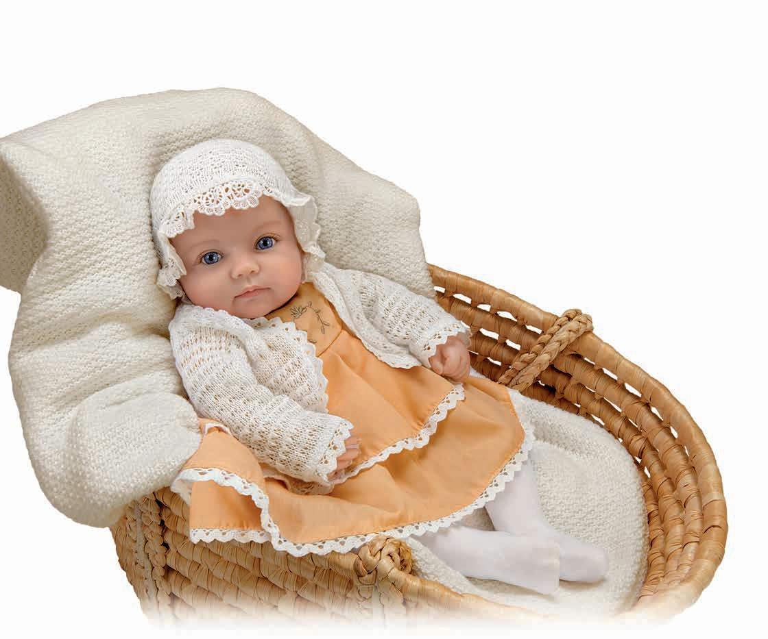 Handcrafted of RealTouch® vinyl and handpainted to highlight each adorable feature, from her blue eyes to her rosy cheeks. She has a soft baby powder scent that smells heavenly, plus she is poseable and weighted to feel like a real baby. Comes in her custom-designed outfit designed to look like the photograph, complete with an orange sherbet-coloured dress, knit cardigan and a bonnet that covers her wispy hand-rooted hair.