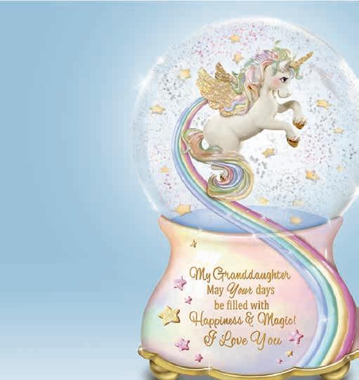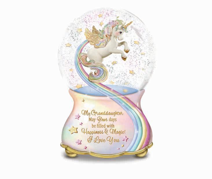 Handcrafted and handpainted in soft pastel colours, this unicorn glitter globe sparkles bright, just like the personality of your granddaughter. With a gentle shake, a flurry of iridescent glitter and golden stars swirl around a handpainted baby unicorn prancing upon a rainbow swirl inside the clear glass globe. Plays: ‘Beautiful Dreamer’.
