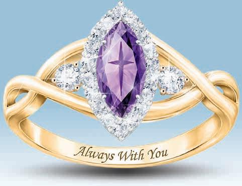 Handcrafted of solid sterling silver and plated in 18-carat gold, this religious jewellery showcases a marquise-cut genuine amethyst stone with an etched cross at its centre. The centrepiece is framed by a halo pavé set with genuine white topaz, which is embraced by two round genuine white topaz stones. The message: ‘Always With You’ is engraved on the inside band.