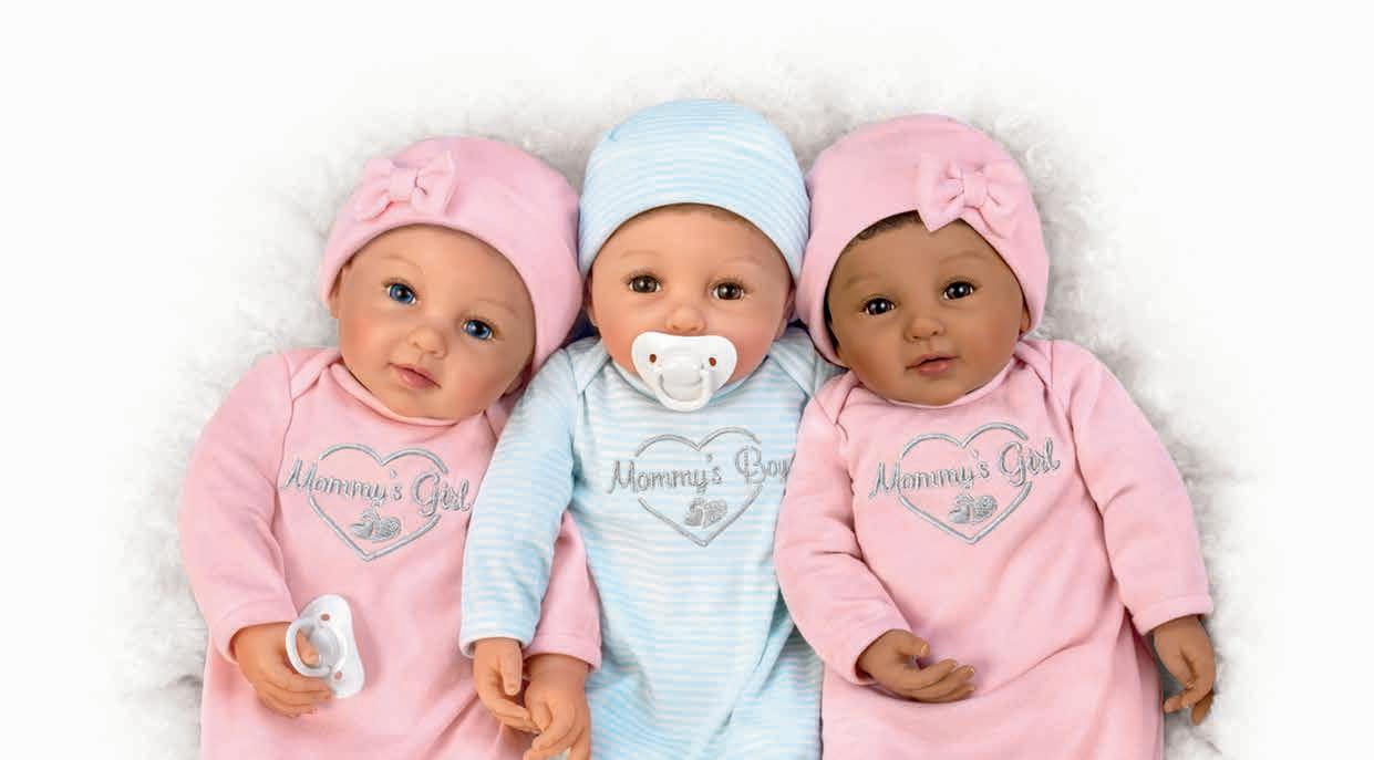 From their RealTouch® vinyl skin to their wisps of hand-rooted hair, these little darlings are 17 inches and handpainted to achieve a realistic warm blush. Each arrives in a custom-designed knotted sleeper, with magnetic dummy. Their beanbag bodies are weighted to feel real, and they are poseable to fit perfectly in your arms.