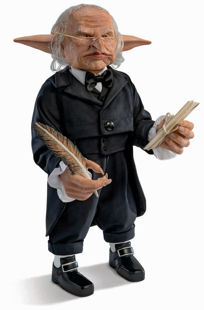 Sculpted by Master Doll Artist Ina Volprich, then recreated in high-quality artist’s vinyl. Glossy inset eyes bring life to that snarling face, and handpainting highlights every magical detail. His poseable arms and legs allow you to display him standing or seated, and his head can be turned side to side. Tailored fabric bank attire including a vest, trousers, and a jacket with tails.