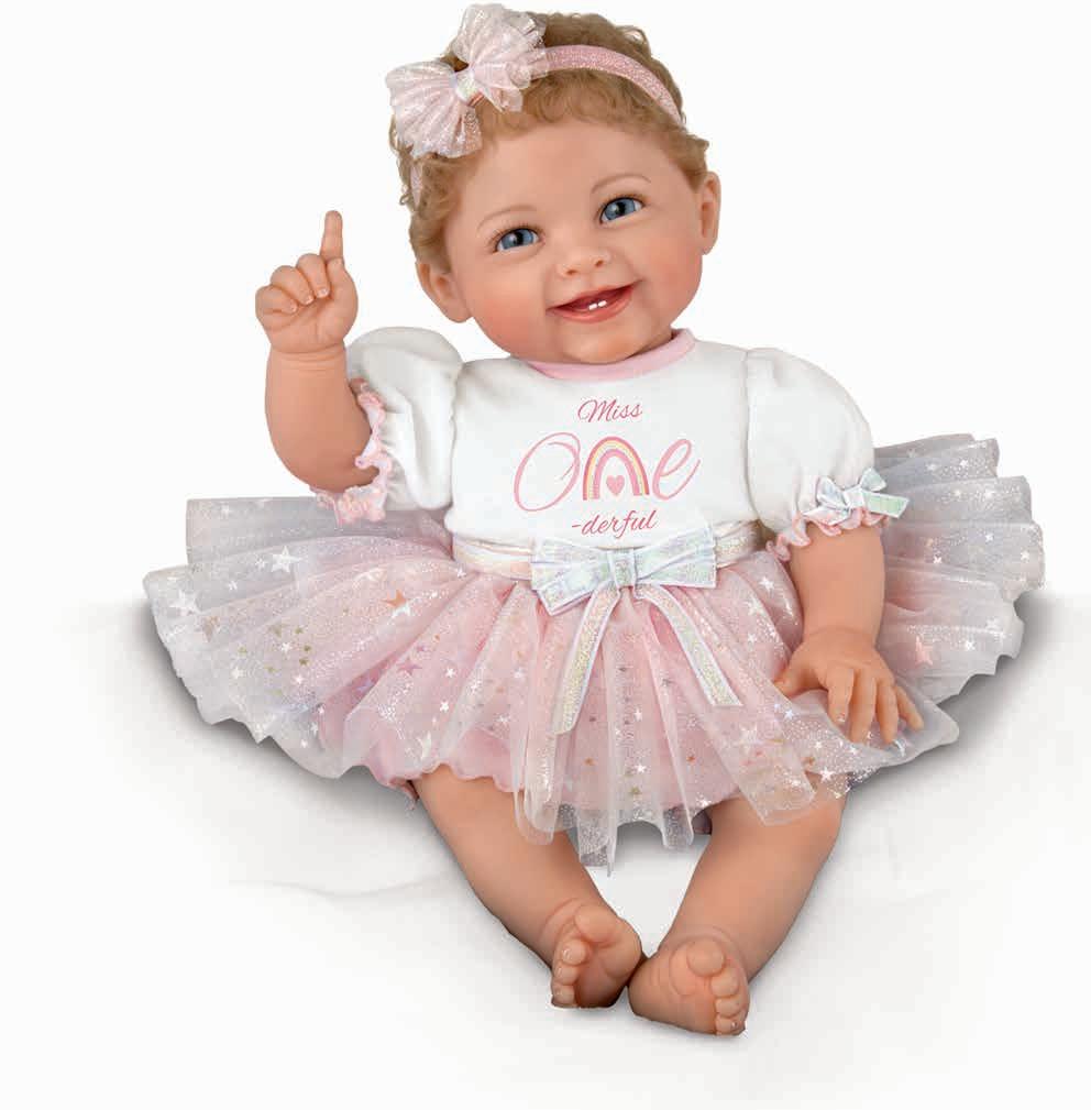 This baby doll features soft RealTouch® vinyl, handpainting and handrooted hair. Her arms are poseable as she holds up the number ‘1’ with her chubby little finger. Her custom-designed dress features bubble sleeves adorned with bows and a tulle skirt covered in iridescent stars. A matching headband tops her curls.