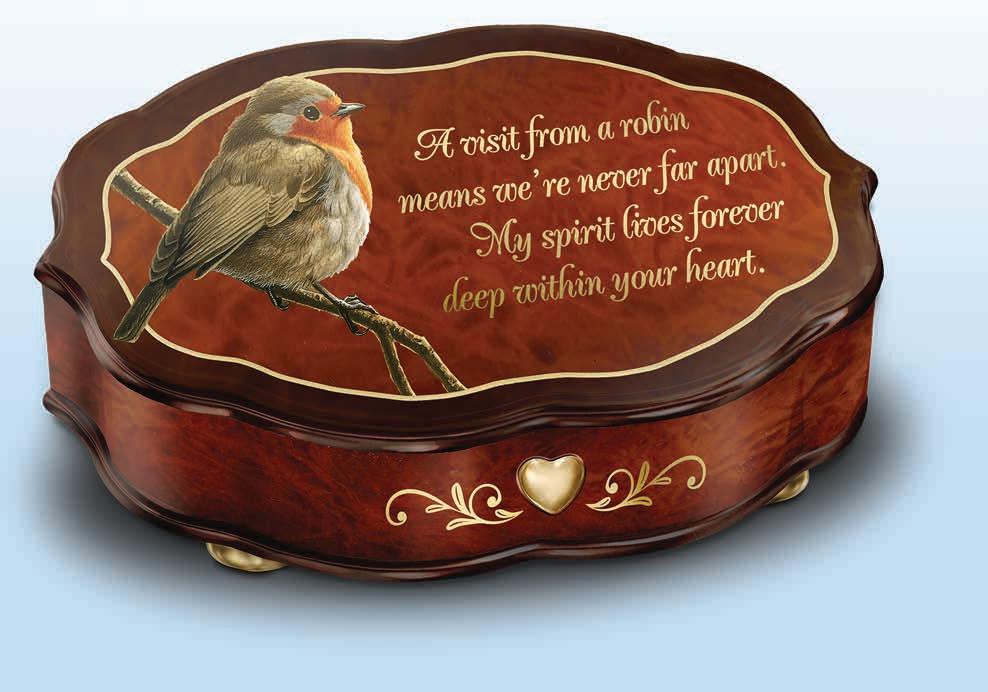 Handcrafted with a design inspired by classic inlaid wood artistry, this music box features the look of burled wood with mahogany and cherry finishes. Showcases the robin art of wildlife artist, Adrian Rigby, and a sentiment. Plays the hymn, ‘Amazing Grace’.