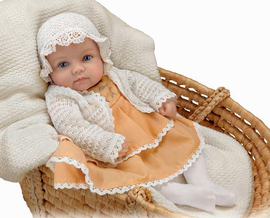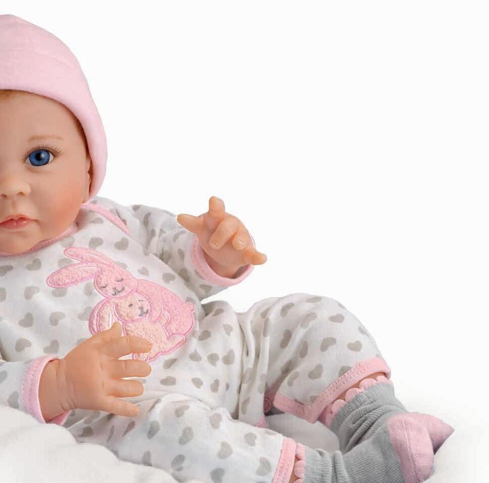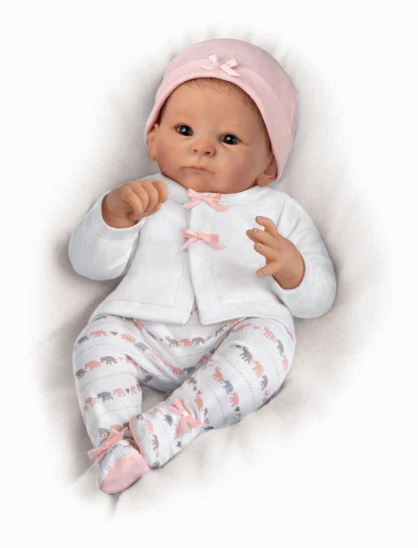 Cast in baby-soft RealTouch® vinyl skin and weighted to feel like a real baby. When you cradle her in your arms, you will notice all of her realistic details, from her hand-blushed tones and individually hand-applied wisps of fine baby hair, to her 10 tiny handpainted fingernails. She’s fully poseable, so she can snuggle right into your arms, warm in her handtailored pink fleece (inspired by the winning photo).