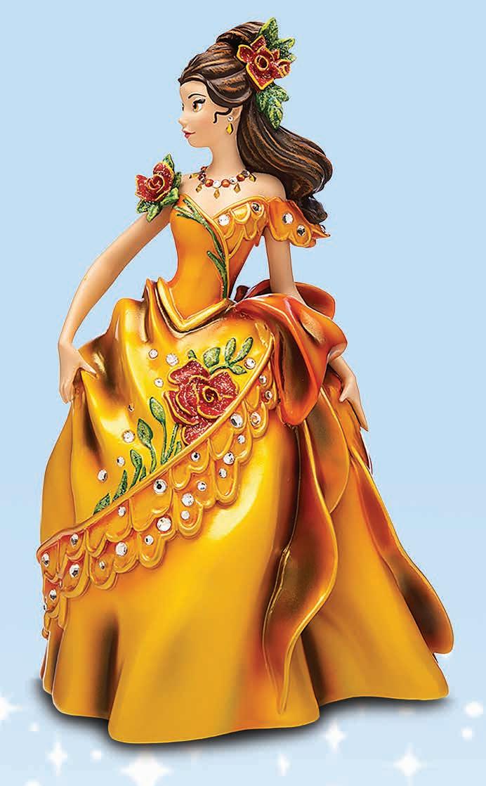 Reimagined in his dazzling style, Bob Mackie’s interpretation of ‘Princess Belle’ showcases this heroine and her golden gown accented with 40 citrine-hued crystals. Embellished with off-the-shoulder bodice and bow. Belle’s gown is handpainted with a pearlescent golden finish fit for a princess. Sculpted flowers sparkle with glitter.