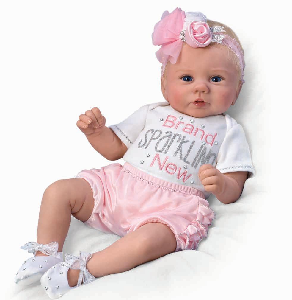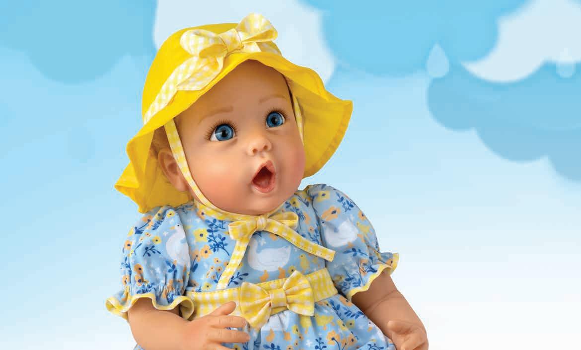 This doll boasts handpainting. Every detail, from her starry blue eyes to the tiny crinkles on her fingers and toes, is handcrafted. Her soft, wavy hair is rooted by hand, she features a baby powder scent, and her skin is crafted from our RealTouch® vinyl.