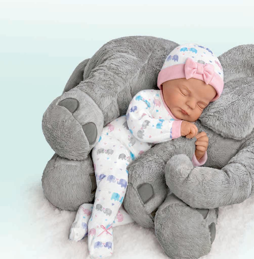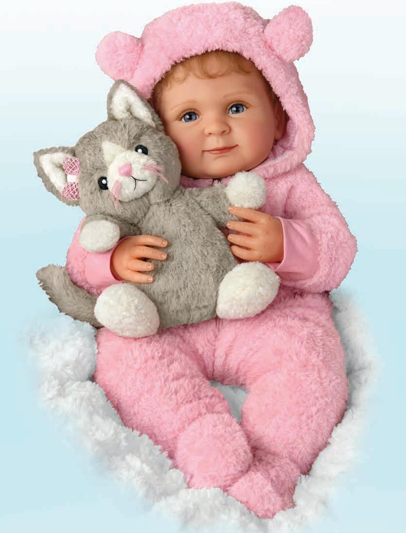 Crafted in RealTouch® vinyl with handpainted features and hand-rooted hair, this realistic baby doll wears an adorable custom-designed outfit. Her hooded and footed pink sherpa sleeper comes with ears on the hood. Her plush kitten pal is grey and white beauty with embroidered eyes, nose and whiskers.