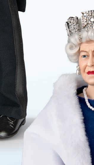 This lifelike tribute of Her Majesty is handcrafted in artist’s resin to capture her features displayed in her famous portrait. Her ensemble is inspired by her Norman Hartnell satin evening dress adorned with a fringe trimmed sash, complete with the notable Order of the Garter star. Sparkling accents are inspired by the George IV Diamond Diadem, a diamond necklace that was gifted by the Nizam of Hyderabad, and the diamond bracelet from The Duke of Edinburgh that was given as a wedding present.