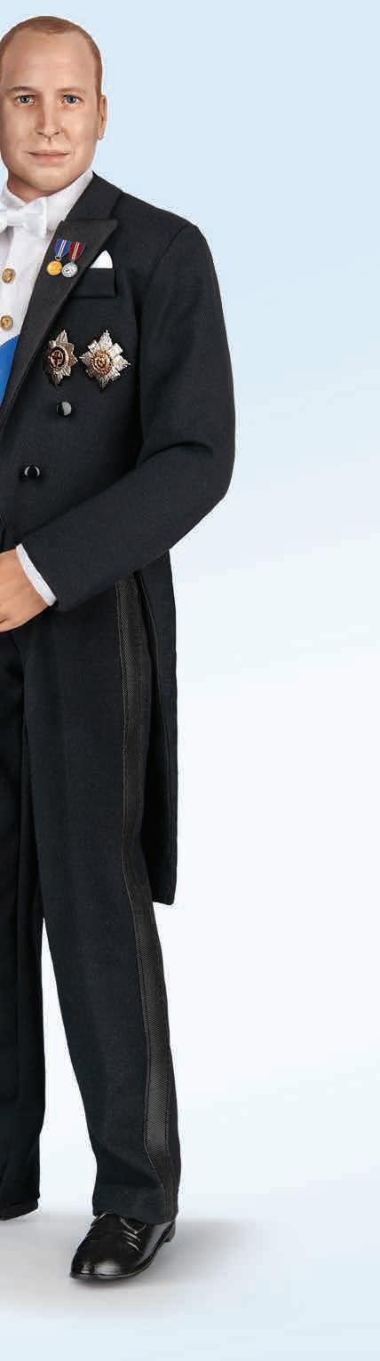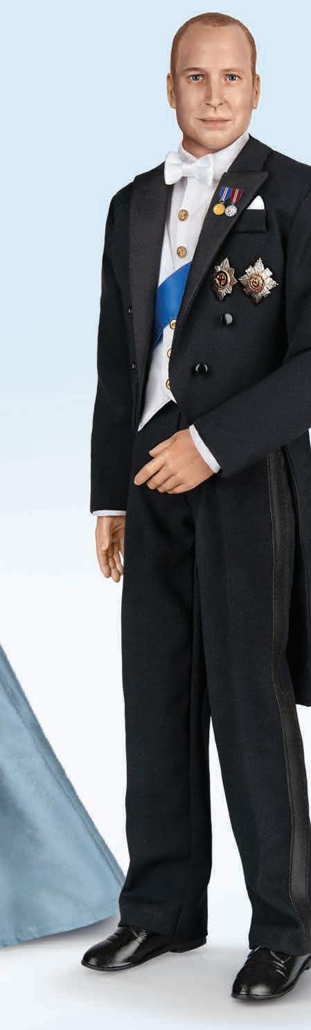 This poseable Prince William doll is handcrafted of artist’s resin and handpainted to capture his authentic likeness, from his chiseled jawline to his piercing gaze and the hairs on his head. His ensemble, complete with bowtie, blue sash, hand-sewn buttons, and tailed jacket, is hand-tailored to recreate attire he wore to the 2022 State Banquet. Handpainted recreations of his brooches and medals emblazon his tuxedo.