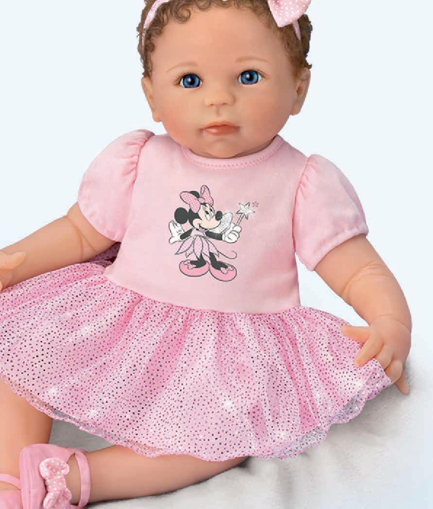 Expertly handcrafted, this RealTouch® vinyl doll has hand-rooted hair and is poseable with a cloth body. She arrives wearing a 4-piece doeinspired ensemble, including a sleeping gown, fold-over mittens, a pink camo blanket and a sleep cap.