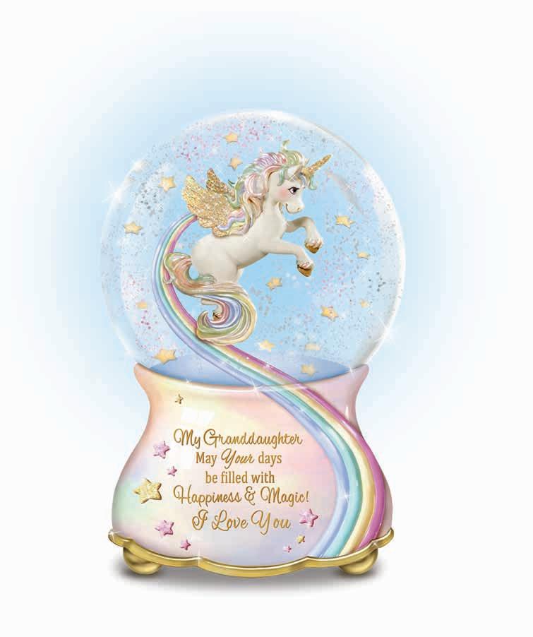 The base of this tree has been crafted with a unique snow globe design. Peer inside, and you’ll discover a Thomas Kinkade holiday scene recreated in three dimensions, every detail of this miniature home, merry townspeople and colourful decorations cast and painted by hand. The flick of a switch sets the swirling snow in motion, while a medley of eight holiday carols begins to play and a glow from inside the sculpted home adds to the enchantment!