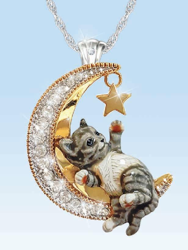 This irresistible creation is handcrafted and plated in rhodium-platinum. Shaped like a crescent moon, it shimmers with a pavé of 17 crystals, a beaded border and a gleaming inside edge that is accented with 18-carat gold. Cradled in the centre of the moon is the sculpted, hand-enamelled kitty, reaching up for a golden star dangling above. A diamond glitters from the bale.