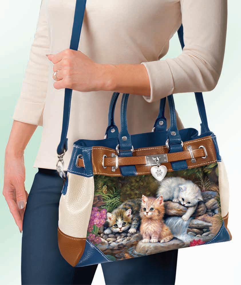 Handcrafted from pebbled faux leather in colour-block combinations reminiscent of a wintery aurora borealis. James Meger wolf art adorns the front, whilst blue double faux leather handles and an adjustable, removable cross-body strap, a zipped main compartment, an interior zipped pocket and two slip pockets. A golden crescent moon charm suspends from a co-ordinating style belted accent.