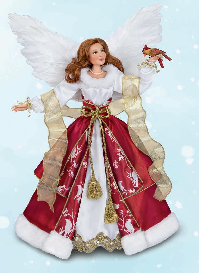 Handcrafted of artist’s resin and handpainted, this poseable angel holds a cardinal duo. She boasts faux feather wings and an ensemble featuring a removable, reversible outer skirt with a cardinal design, crafted from cranberry and white satin and accented by faux fur and golden ribbon. At the touch of a button, she plays four classic carols.