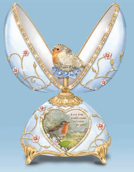 Egg-shaped music box features Heirloom Porcelain®, hand-glazed in a blue hue and complemented by 22-carat gold accents in addition to more than 100 hand-set faux crystals. The base bears a heart-shaped design, adorned with the robin art of wildlife artist, Adrian Rigby and a message of love. Open to discover a handpainted robin on a wreath of forget-me-nots. Plays: ‘Amazing Grace’ at the turn of a key.