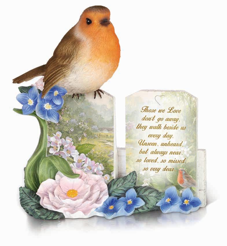 Like cheerful robins, treasured memories appear when you need them most! In many cultures, a friendly little robin represents a loved one who has passed. A heartwarming keepsake of a cheerful robin red-breast posed on a post with the stirring artistry of Adrian Rigby, and graced with a golden sentiment dedicated to your much-missed loved ones.