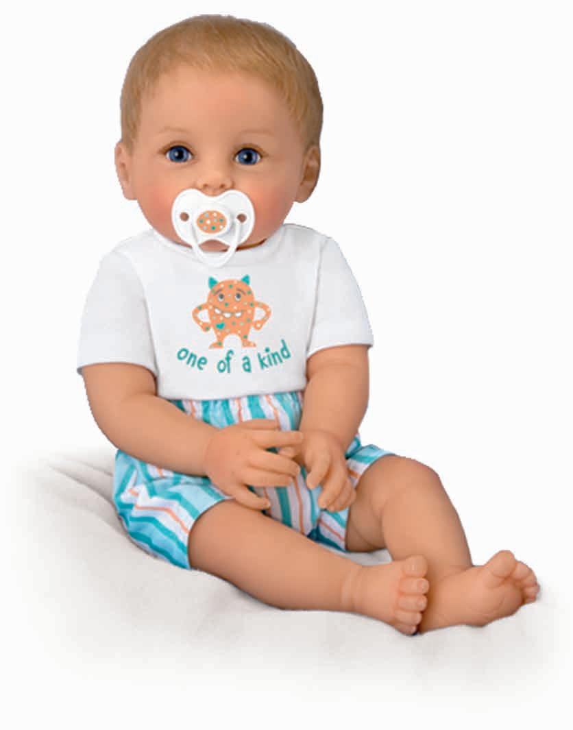Handsculpted for realism, this baby monkey is crafted of our signature RealTouch® vinyl, with hand-applied hair and a weighted cloth body. He’s handpainted to look So Truly Real®, and sized at 22 inches! Abe comes to you in a blue print onesie complete with a matching hat and a toy ball.