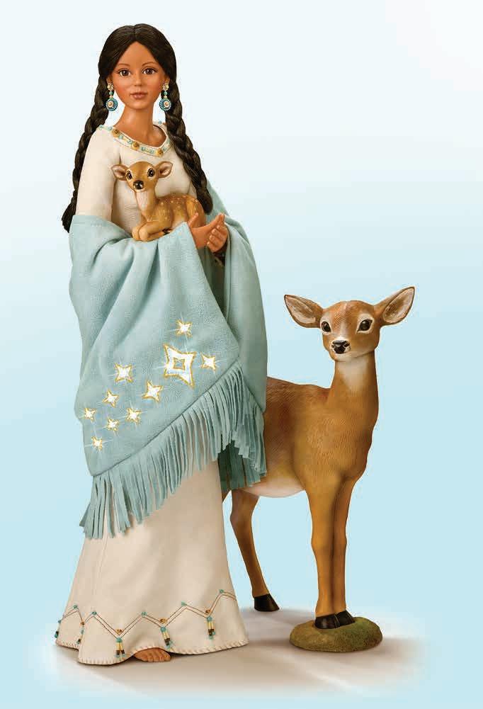 This portrait doll wears a custom-designed ensemble featuring handsewn beadwork inspired by a Native American design, and a removable shawl with a Morning Star design that lights up with LEDs at the flip of a switch. She arrives with her 2 deer companions, a doe and a fawn.