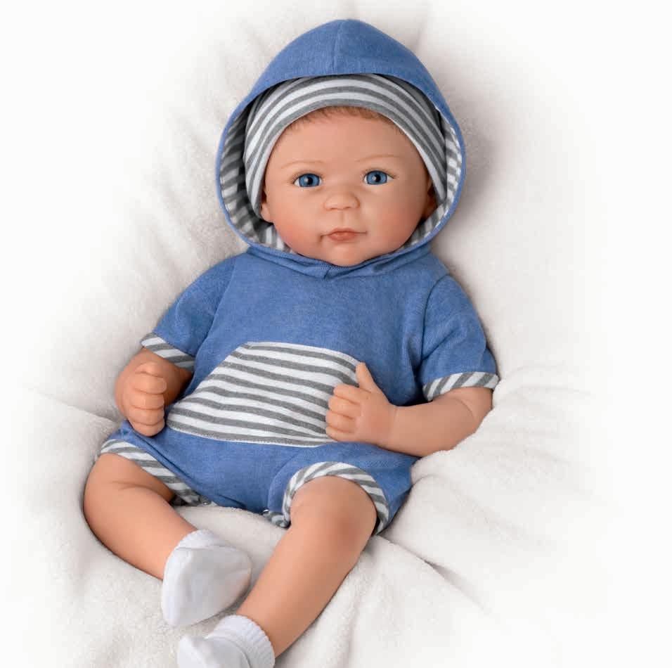 This lifelike baby doll is handcrafted in soft RealTouch® vinyl with handpainted features, hand-rooted hair and a soft baby powder scent. Aiden wears a classic cable knit sleeper complete with a cap decorated with puppy ears and matching socks. He also has a weighted, poseable cloth body to feel So Truly Real®, and he comes with a magnetic dummy.