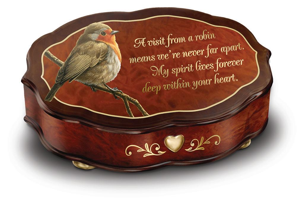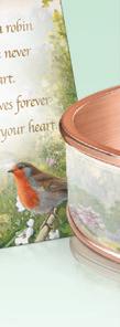 Features the art of artist Adrian Rigby, depicting a robin, perched in the countryside, amidst pink blossoms. The robin is joined by a pair of blue tits and a wren. The inside is engraved with: ‘My Spirit Lives Forever Deep Within Your Heart’.