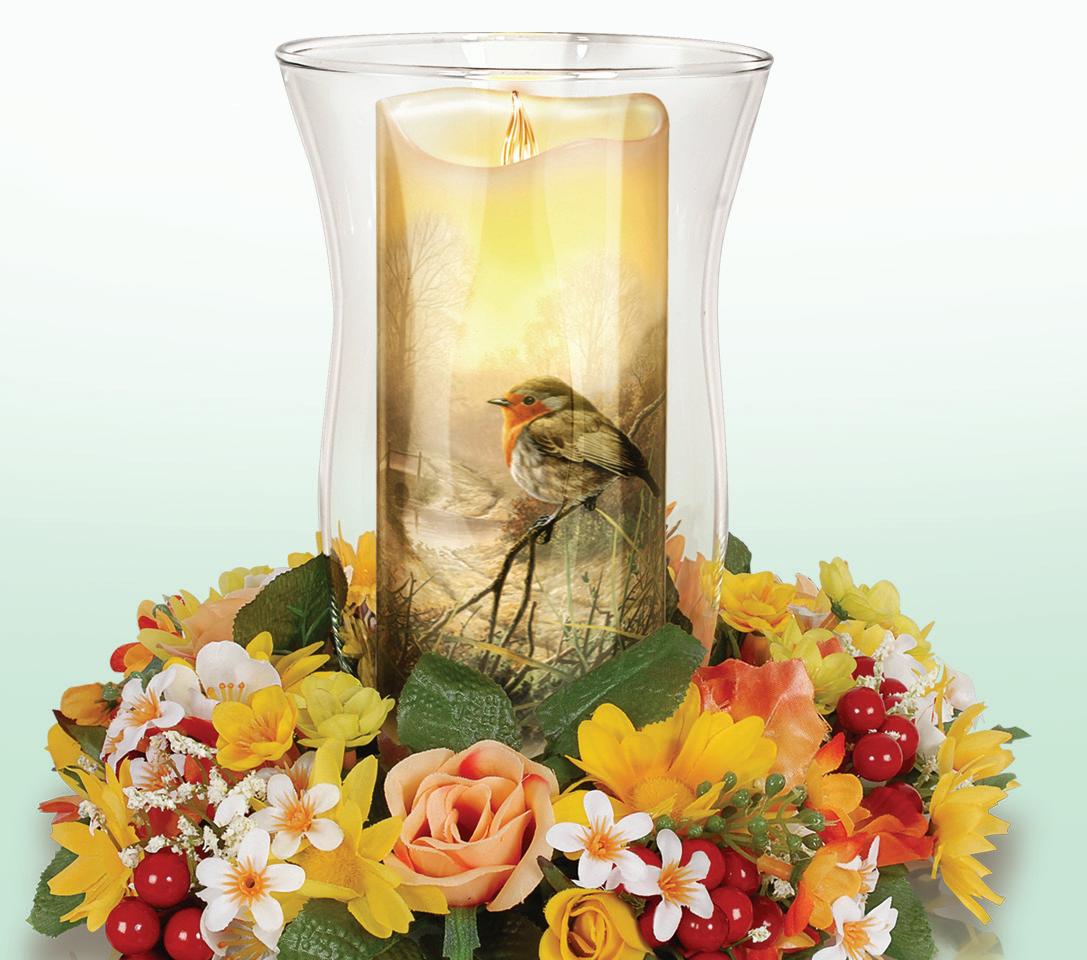 This edition is crafted by hand and features a cream-toned flameless candle. The candle is adorned with famed ‘Dawn’s Bright Herald’ artwork by wildlife artist Adrian Rigby and proves a striking centrepiece to a glass hurricane-style shade. The shade itself is embraced by an everlasting silk floral wreath featuring realistic deep russet and amber blossoms in addition to berries. Fills your home with the delicious scent of vanilla.