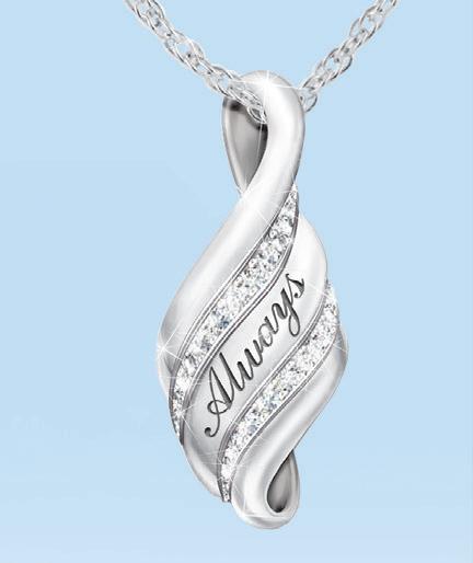 A robin with pearl enamel red breast and crystal accents perches on a 24-carat goldplated crystal-embellished infinity loop. This perfect symbol of the eternal love is engraved with: ‘Always’ on the front of the loop, whilst a suspended heart charm is inscribed with: ‘We’re Never Far Apart’.