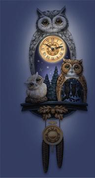 This handcrafted and handpainted wall clock is inspired by Blake’s original art and captures a family of owls. Etched ‘feathers’ on each owl’s wings and atmospheric reliefs within. Owl calls sound at every hour.