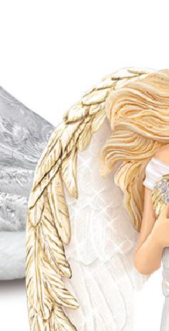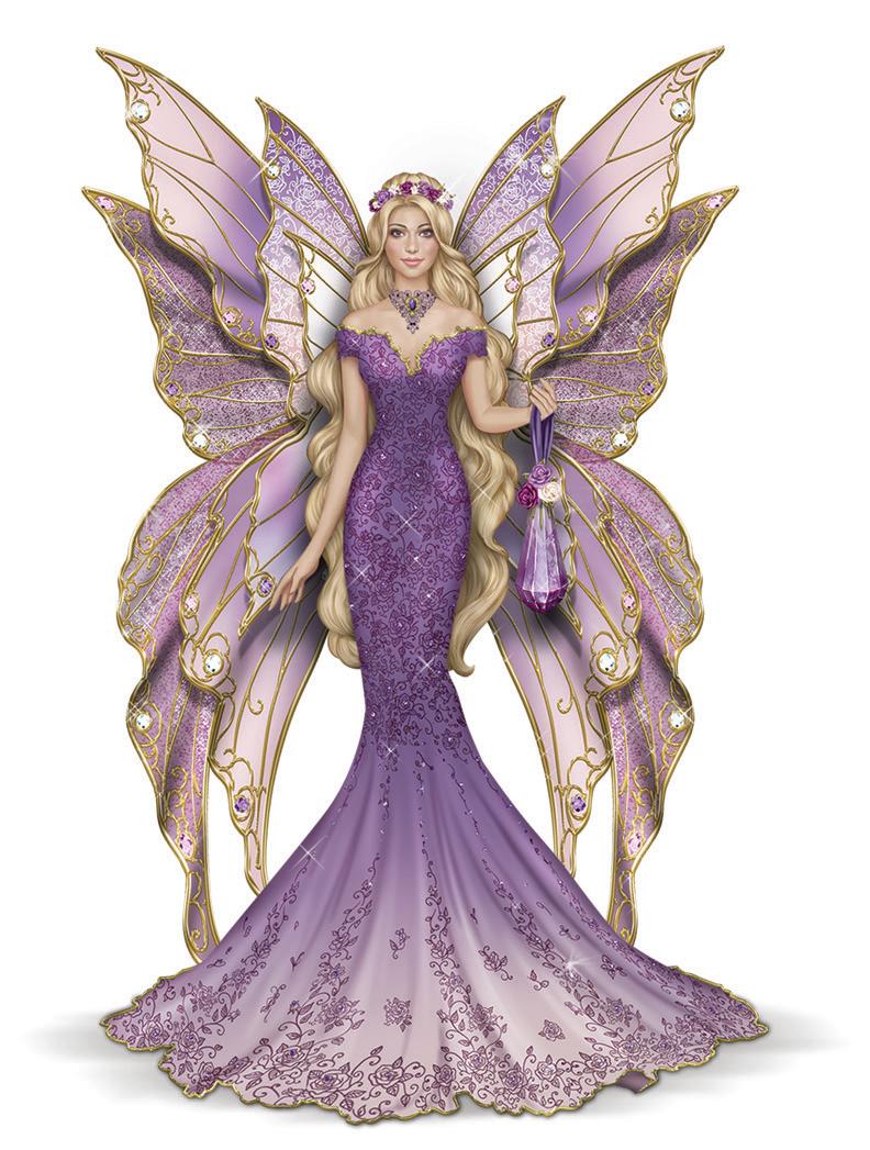 Handcrafted and handpainted by master artisans that work closely with original artist, Sara Biddle. From the layered design of her butterfly-like wings with hand-applied glitter to the raised-to-thetouch metallic golden trim of her etched gown that boasts a glittery twinkle. She holds onto a faceted, simulated crystal with sculptural flowers, with the colour of amethyst. Item No. 09-09445-001