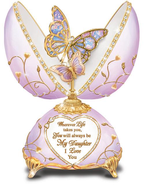 Hand-crafted from gleaming Heirloom Porcelain®, and lavished all over with hand-applied 22-carat gold, the music box features more than 80 faux gems. The egg opens to reveal two delicate butterflies. Fully sculpted and painted entirely by hand, the sculpture is resplendent in rich detail. Plays the melody ‘You are So Beautiful’.