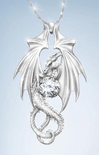 This pendant features a fully-sculpted dragon. Plated in sterling silver and set with an icy crystal, the dragon commands attention at an eye-catching two inches.