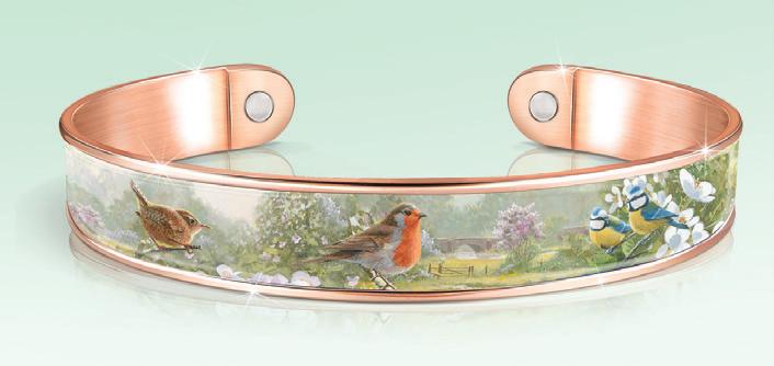 Handcrafted from copper with rose gold-plating, this filigree bangle-style edition features two magnets at either end. The bracelet showcases a central heart-shaped design with an enamel robin, embraced by a leaf and flower patterning. The jewellery edition glimmers with Svenka™ crystals!