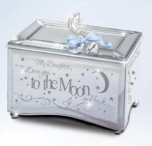 Handcrafted of bevelled mirrored glass, with a scrolled design sprinkled with an abundance of sweet stars and the sentiment: ‘My Daughter, I Love You to the Moon and back’. The nameengraved charm is tied on a soft blue ribbon to a half-moon handle that sparkles with crystals and is embellished with a dangling heart whose centre is a crystal. Plays: ‘You Are So Beautiful’. Item No. 01-22547-001P 2 instalments of £34.99 Plus £6.99 S&S*