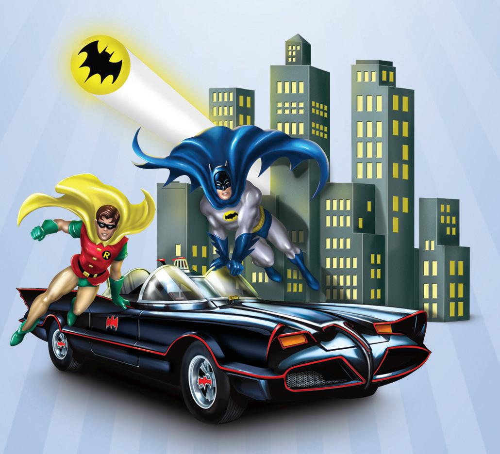Handcrafted to capture the DYNAMIC DUO™ in powerful action poses directly inspired by scenes from the classic TV Series. Features the DYNAMIC DUO™ leaping into the BATMOBILE™ before the GOTHAM CITY™ skyline and the bat signal really lights up. It plays the theme music from the show!
