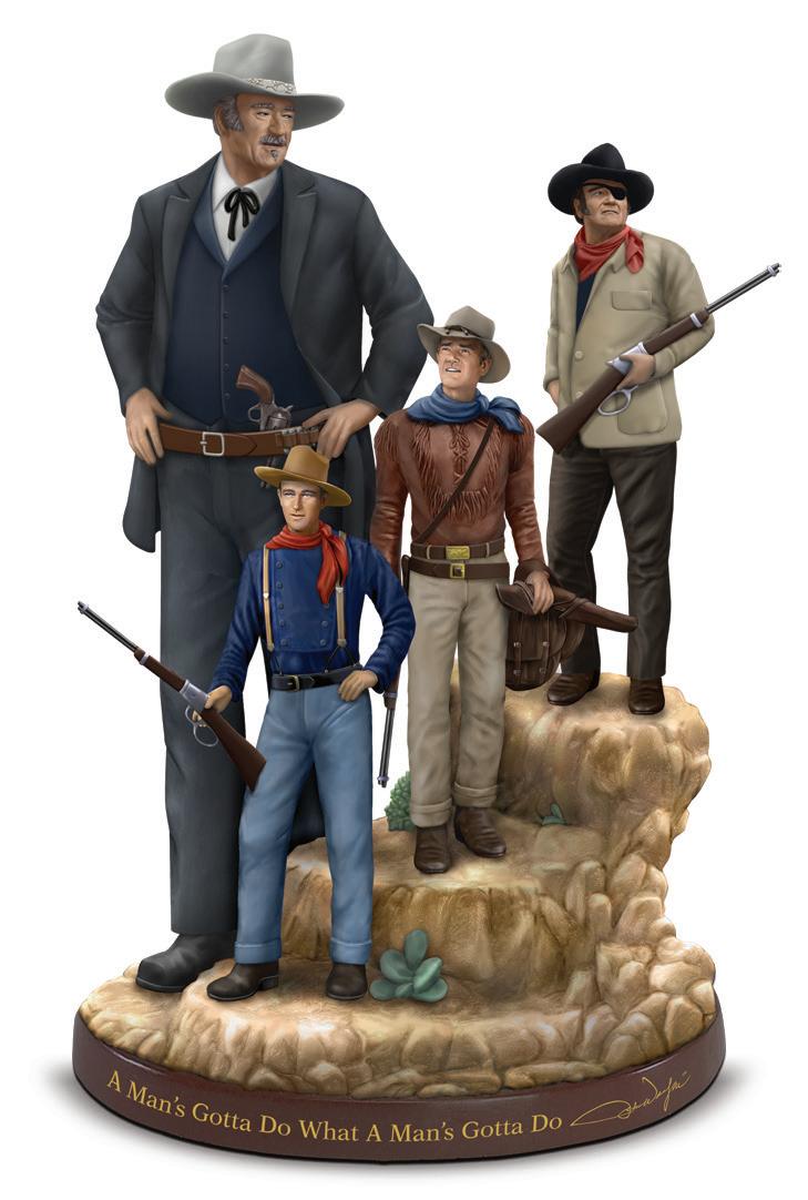 Handcrafted and painted by hand in colour with metallic accents on the rifles, guns, and belts. From the brim of his cowboy hat to the toes of his rugged boots, every detail is crafted to recreate the magic of John Wayne’s celebrated movies. The hand-applied sentiment on the wood-look bottom of the base captures the famous words and reproduction signature of Duke himself.