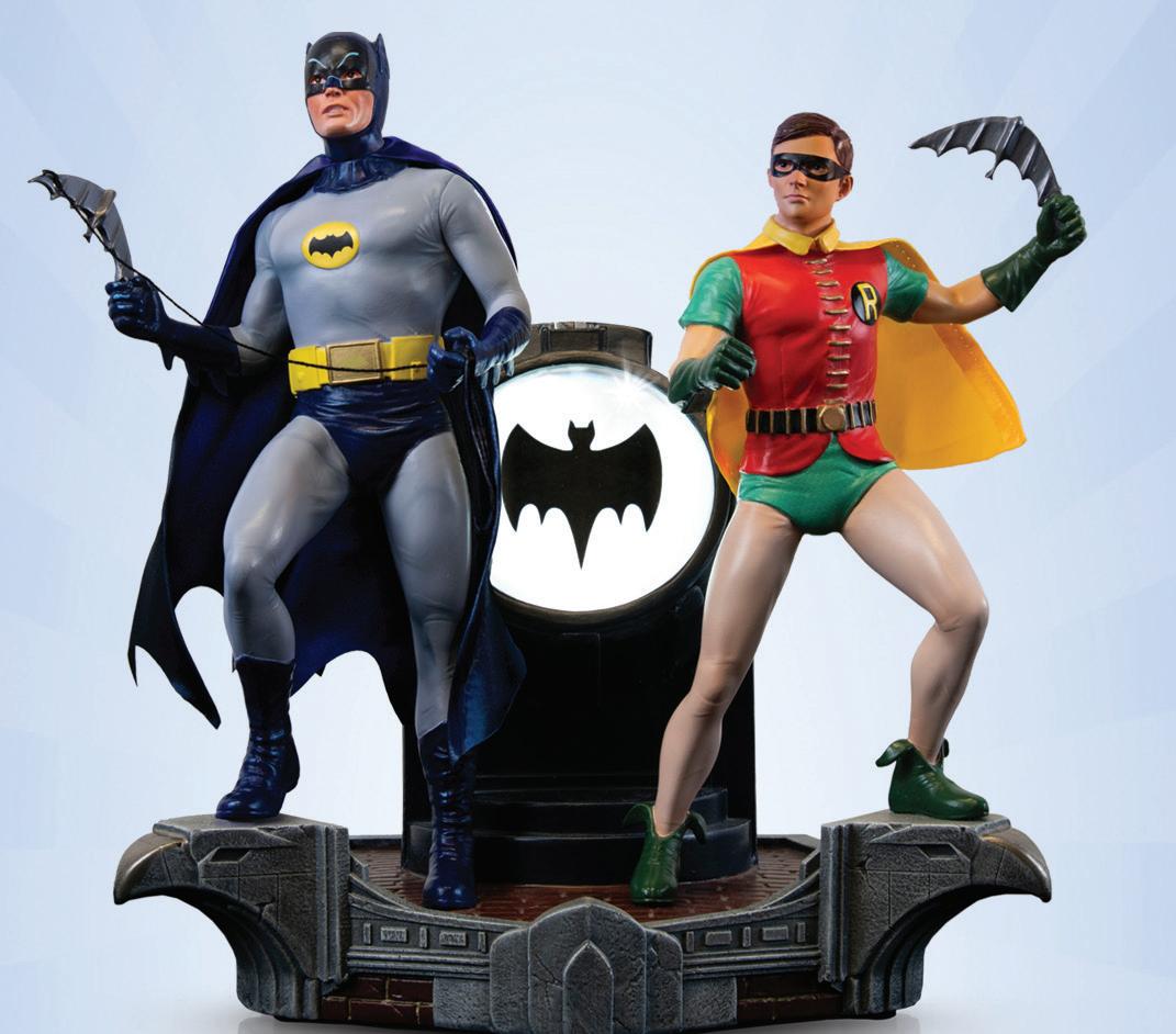 Features the Dynamic Duo™ posed atop the Gotham City™ Police Department, answering the illuminated Bat-Signal™. Handpainted sculptural detail brings out the vibe of the original TV series. The poses, facial expressions, composition and much more – including real fabric, satiny-finish capes – evoke the heroic diligence of TV’s most beloved crime fighters.