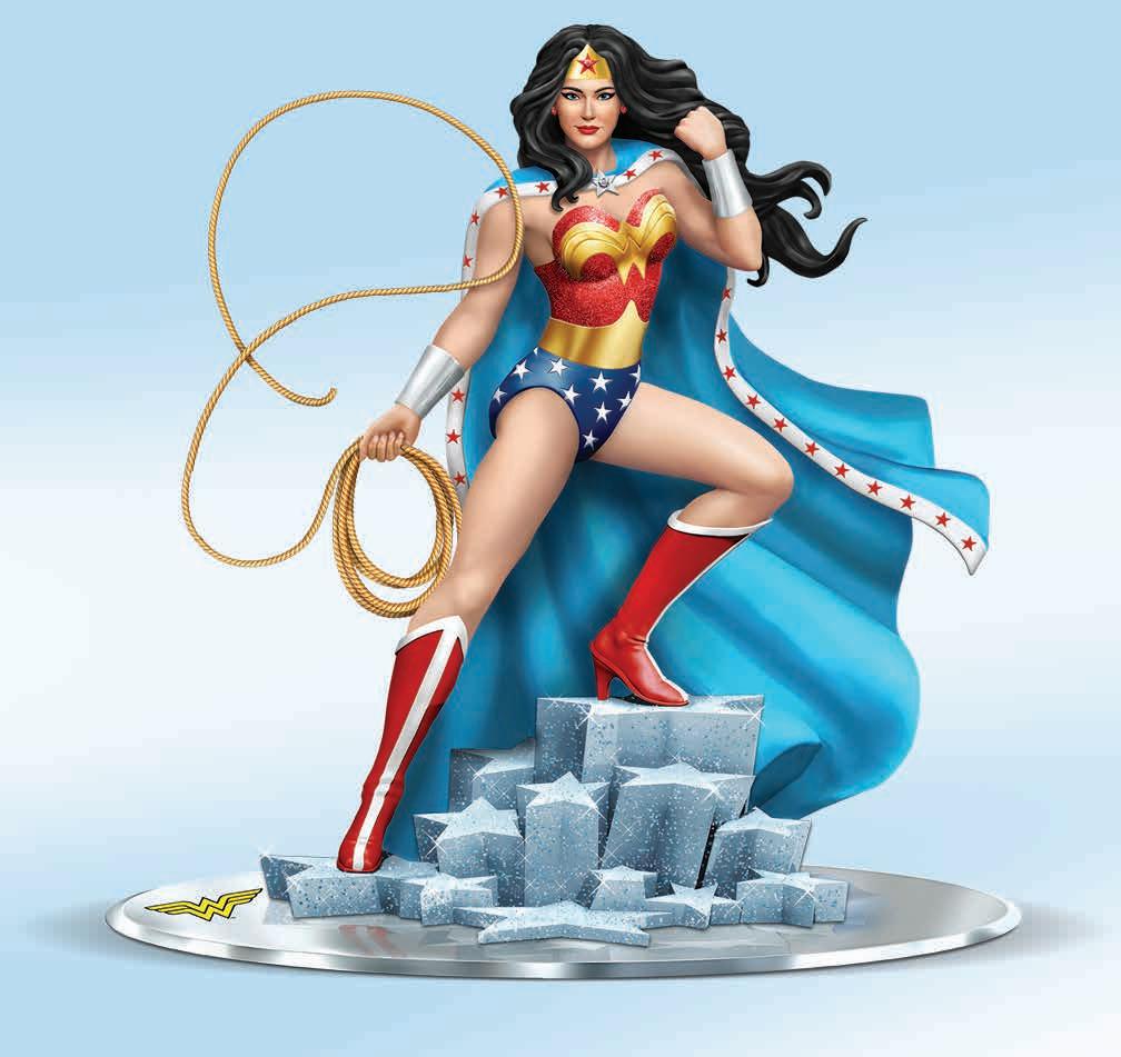 Handcrafted of artist’s resin to capture every detail, from her famous pose holding the Lasso of Truth –handcrafted of specially cast zinc rope – to her costume and Bracelets of Submission. Svenka™ crystals, glitter and pearlescent and metallic accents. She stands atop a mirrored base boasting the official Wonder Woman logo. Item No. 09-07851-001