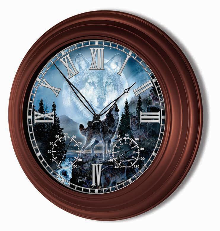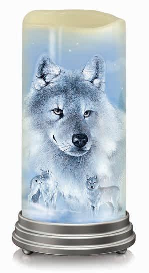 Each of the 12 interchangeable stained-glass month panels in this collection is handcrafted to recreate every detail of Al Agnew’s original, colourful paintings. Each is enhanced by a stained glass-style border and the name of the month. With a flip of the switch, hidden LED lights within the wooden display illuminate the scene from within. The impressive display features a woodgrain finish with a howling wolf pack at the top and golden days of the week.