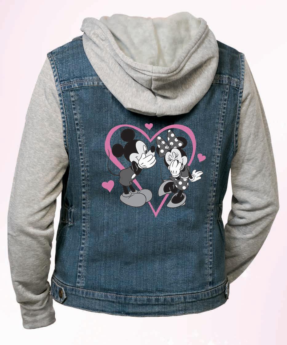 This ladies’ vested hoodie is crafted with soft grey cotton-blend sleeves and hood, and a mid-weight denim body. The front features an appliqué patch with embroidered pink thread of Mickey Mouse and Minnie Mouse with the word ‘love’. On the back is a printed image of the duo in black and white along with pink hearts. Jersey lining, knit cuffs, hip pockets, snap front, two chest pockets and flattering seams.