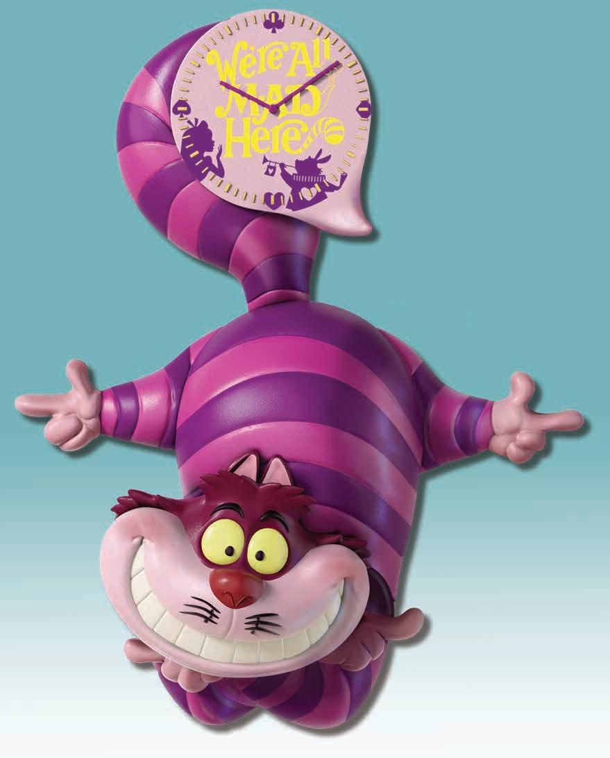 This clock captures Cheshire Cat in fully-sculpted, handpainted detail. His moving grin and eyes move back and forth like a pendulum, perpetually pointing the way with whimsical delight. The clock face features silhouette art of movie characters along with the cat’s famed line: ‘We’re All MAD Here’ in glow-in-the-dark letters.