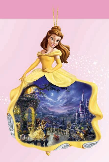 Sculpted from fine artist’s resin, handpainted, and recreating Belle’s iconic appearance and ensemble. Artwork by Thomas Kinkade Studios depicting memorable moments in the character’s story is displayed on her gown. Each ornament boasts fabric accents, and is suspended from golden cord.